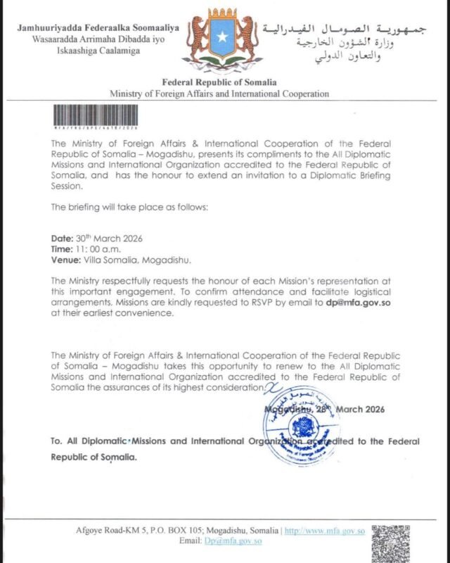 MOGADISHU — The Federal Government of Somalia has urgently summoned all accredited diplomatic missions and international organizations to a high-level briefing at Villa Somalia, as international concern mounts over the escalating political and military crisis in South West State.