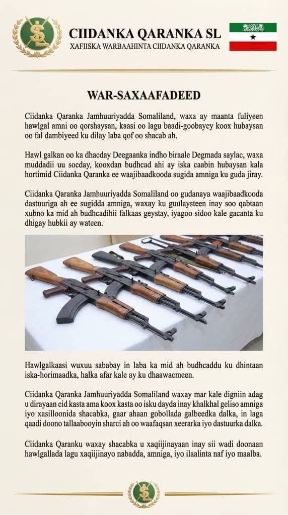 SAYLAC — The Somaliland Army has confirmed that it conducted a significant security operation in the Salal region today, resulting in the neutralization of an ‘armed group accused of destabilizing the western borderlands’.